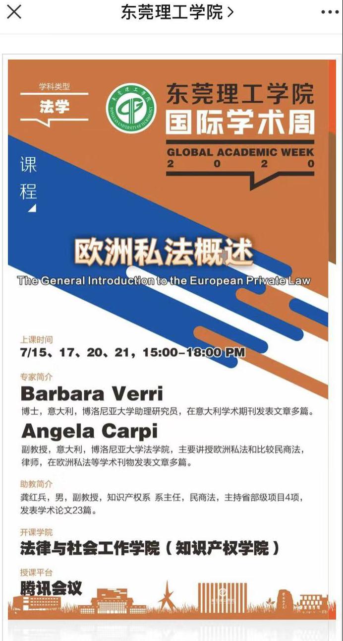 2020年7月15日,Dr. Barbara Verri的《欧洲私法概述》(The General Introduction to the European Private Law)国际课程正式开始,为期4天,共16个课时,课程内容包括:1、欧洲私法介绍、欧洲私法的渊源、实现欧洲私法统一的法律手段(Legislation measures and soft law);2,重点讲授了《The Draft common Frame of Reference》(共同参考框架草案)也称“欧洲民法典草案”的立法过程、立法目的、实现途径和主要框架;3,欧洲合同法的主要原则、欧洲消费者保护指令、以及数字经济下,欧洲数字电子合同指令和数据保护条例的主要内容。