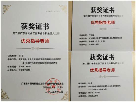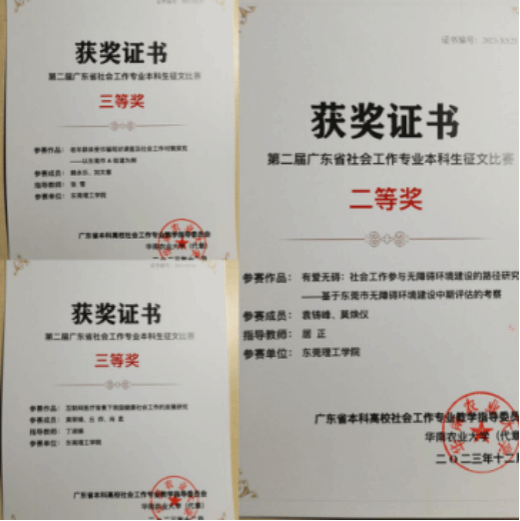 由居正老师指导,本科生袁铸峰、莫焕仪同学合作论文《有爱无碍:社会工作参与无障碍环境建设的路径研究——基于东莞市无障碍环境建设中期评估的考察》荣获二等奖;由丁淑娟老师指导,黄荣婧、丘烨、肖柔同学合作的论文《互联网医疗背景下我国健康社会工作的发展研究》荣获三等奖;由张雪老师指导,赖永乐、刘文慧同学合作的论文《老年群体受诈骗现状调查及社会工作对策探究——以东莞市A街道为例》荣获三等奖。在本次征文比赛中,麻豆