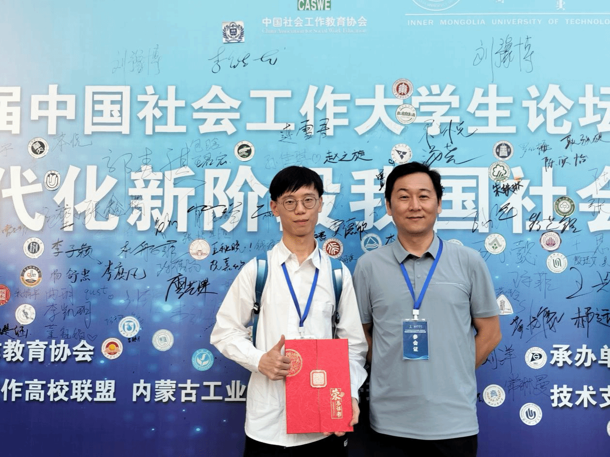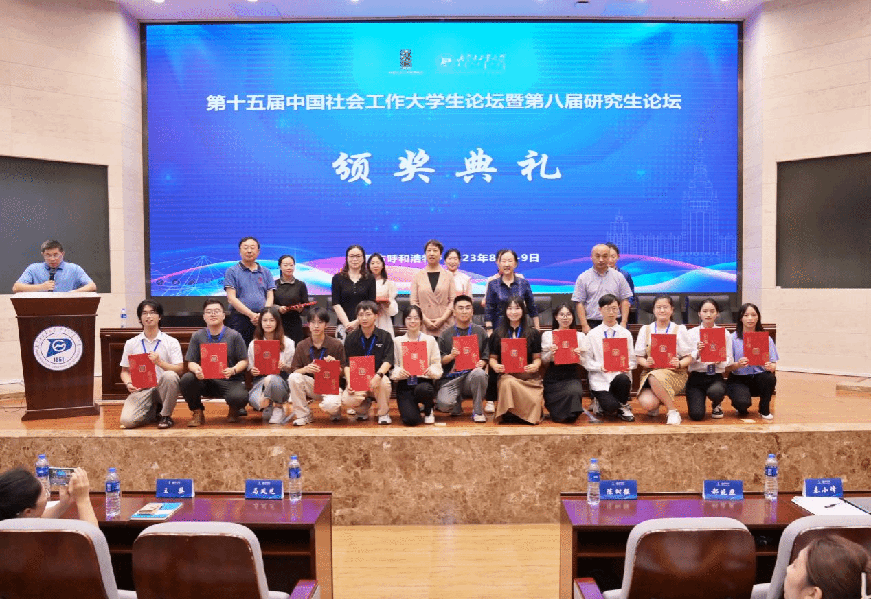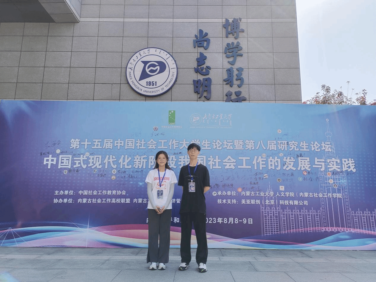2023年8月8日至9日,“第十五届中国社会工作大学生论坛暨第八届研究生论坛——中国式现代化新阶段我国社会工作的发展与实践”于在内蒙古呼和浩特内蒙古工业大学新城校区成功举办。法社学院社会工作系2021级袁铸峰和王帼萍同学获邀参会,其中袁铸峰同学被选为分论坛主持人,其分享的论文《社会工作何以介入自闭症儿童抢救性康复——以 D 市“与星同行计划”为例》荣获本科生组二等奖。