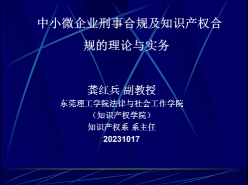 (知识产权学院)龚红兵副教授于2023年10月16日在大岭山颜屋村村委会给30多家的企业家代表以《中小微企业刑事合规及知识产权合规的理论与实务》为题进行了法治讲座。龚红兵老师以:一、涉案企业合规的政治背景与政治意义(中央相关合规政策介绍);二、涉案企业合规刑事司法政策语境;三、涉案企业如何进行合规整改;四、企业知识产权合规建设的实践路径等四个专题进行了讲授。