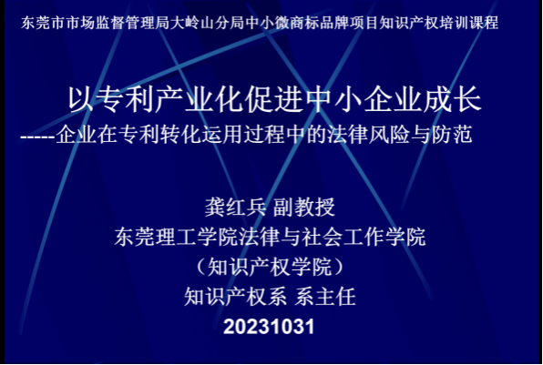 (知识产权学院)龚红兵副教授于2023年10月31日在大岭山百花洞村委会为30多家的企业家代表以《以专利产业化促进中小企业成长---企业专利转化运用过程中的法律风险与防范》为题进行了讲座。