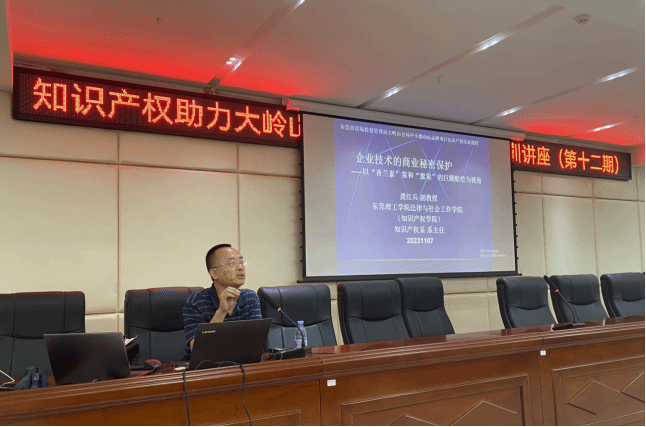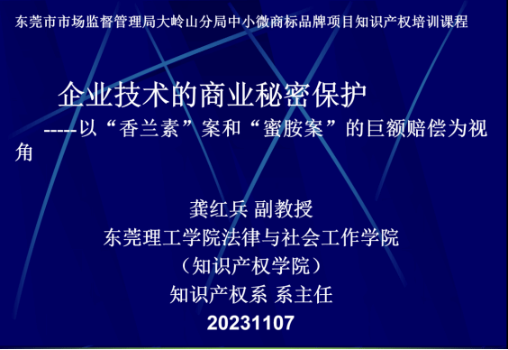 (知识产权学院)龚红兵副教授于2023年11月7日在大岭山杨屋村村委会为30多家的企业家代表以《企业技术信息的商业秘密保护》为题进行了讲座。