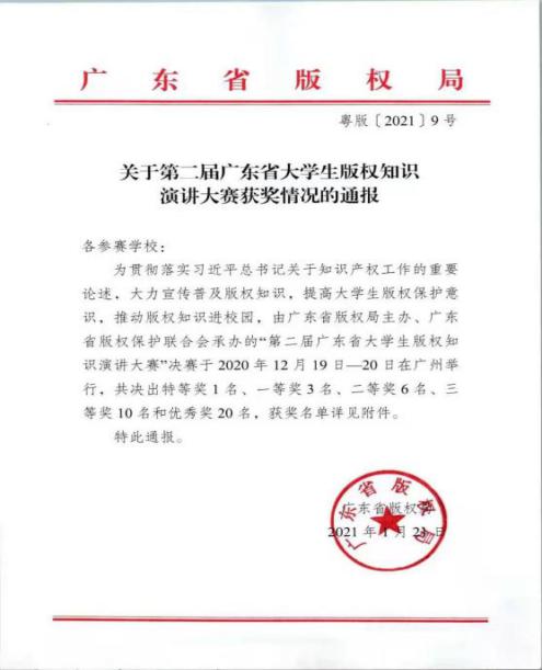 近日,在2020年度广东省大学生版权知识演讲大赛中,我校麻豆
