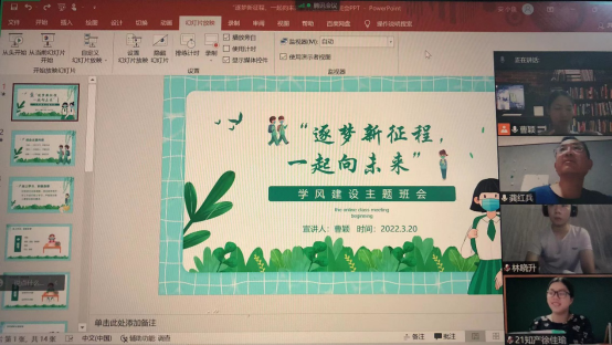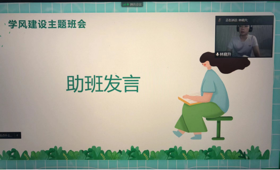 此次班会主要有三个议程。第一个议程,关于线上学习情况了解。根据学校疫情防控要求,全校进行线上教学。由于线上学习受设备或网络方面的困扰,同学们就该问题向助班以及班长反映,班长积极为同学们寻找解决方案,顺利解决线上学习困难。关于选课问题,助班作为学长也提出关于自己的有效的方法和线上学习的有效方法,帮助同学们共同培养自律的生活模式,提高线上学习效率。班长也表示,“我们应当积极进行自我调整,结合新学期开学要求进行线上学习,严格落实线上课堂的相关要求,提高自律性”。