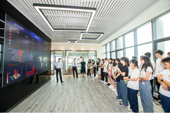 除此之外,我们还来到了一楼的展示大厅。大厅的设计充满了现代科技感,彰显出知识产权对于企业发展的重要影响。大厅内整齐摆放着相关海报,有序地展示了21世纪国家对知识产权的重视和各项政策出台带来的变化。大厅中央的落地大屏幕显示的当前即时变化的各项数据,除了对松山湖国际创新创业社区的基本数据检测以外,还包括成果专利、实验仪器和人才管理等方面的数据展示,体现了万物互联时代的智慧数据处理。