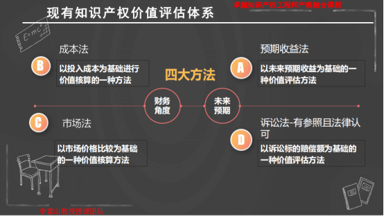 在交易中,实质上没有放之四海而皆准的方法,只要交易双方认可即可。最常见的三种方法为成本法、市场法、收益法。李富山教授在课堂上提到,在现有的知识产权价值评估体系中,有一种区别于其他价值评估的方法——诉讼法,这种方法是以诉讼标的赔偿额为基础的一种价值评估,它有参照且法律认可。